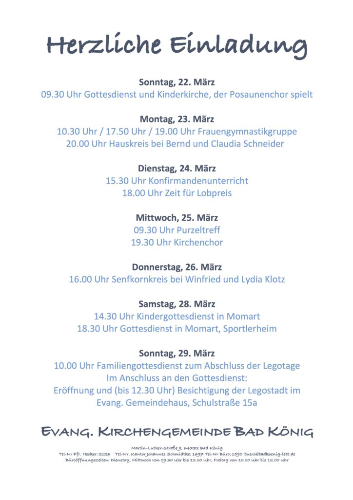 Am Sonntag, 29.4., laden wir ein zu einem fröhlichen Familiengottesdienst zum Abschluss der Lego®Tage um 10:00 Uhr (Achtung – Sommerzeit!) in der Bad Königer Schlosskirche. Im Anschluss besteht dann bis 12:30 Uhr die Möglichkeit, die neu gebaute Lego®Stadt im Gemeindehaus zu besichtigen, die vom Bad Königer Bürgermeister Frank Hofferbert eröffnet werden wird.