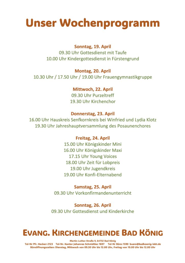 Hier finden Sie Informationen zu einigen geplanten kirchenmusikalischen Veranstaltungen: Kantatengottesdienst Am Sonntag „Cantate“ („Singet!“), am 3. Mai 2026, wird es einen besonderen musikalischen Gottesdienst geben.…